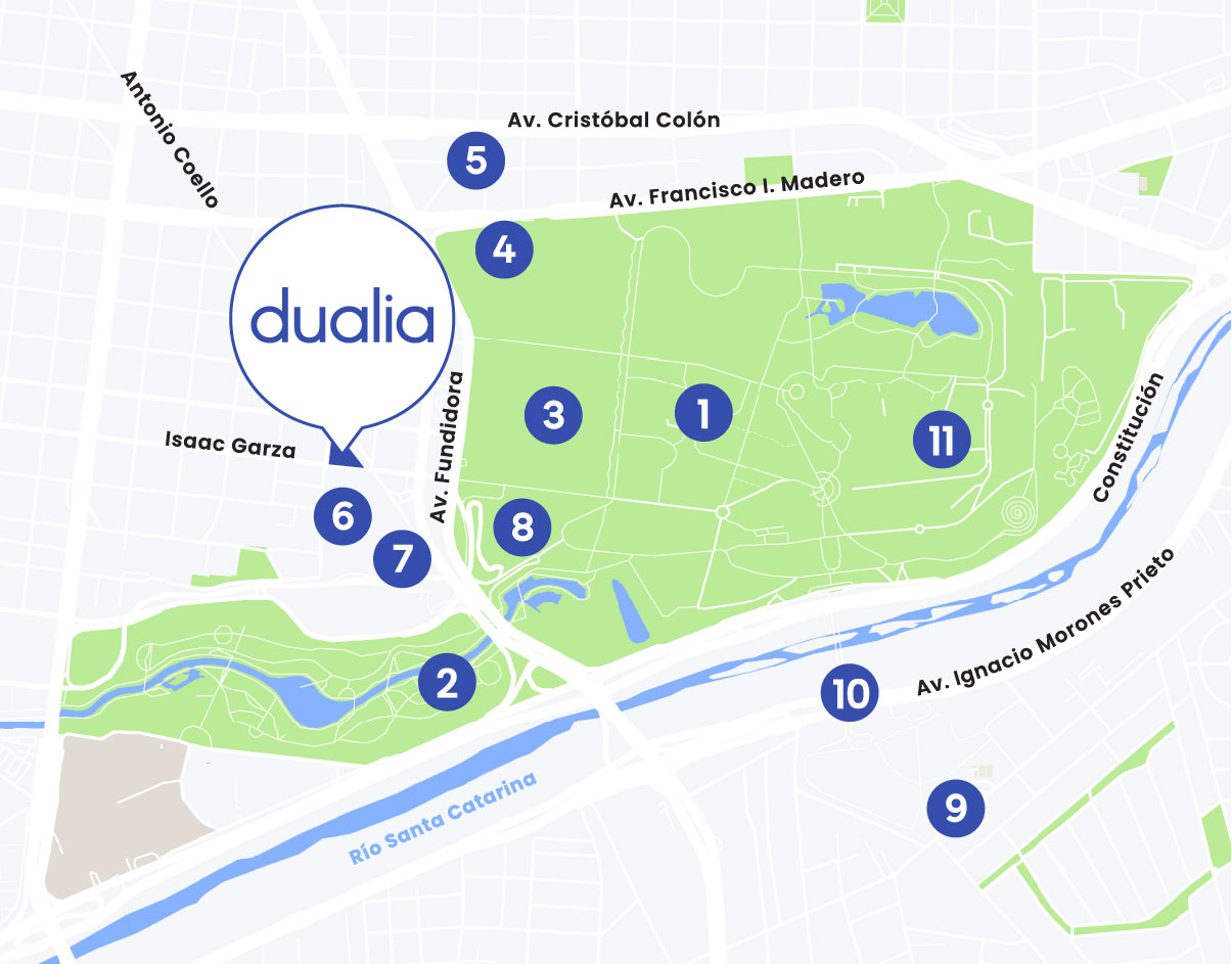 Dualia Paseo Urbano, ubicado a 5 minutos de Paseo Santa Lucía y a unos minutos de Parque Fundidora te acercará a la experiencia del Nuevo Centro de Monterrey, con una propuesta de vivienda vertical extraordinaria.